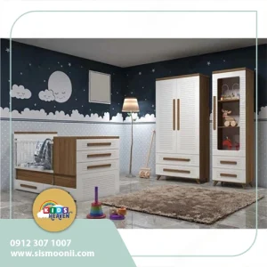 سرویس خواب کودک و نوزاد مدل کرکرهای: طراحی با درب و تزیینات کرکرهای، جنس MDF با روکش مقاوم، ترکیب کمد، تخت و ویترین، ظاهری مدرن و کلاسیک، مناسب استفاده طولانیمدت.
